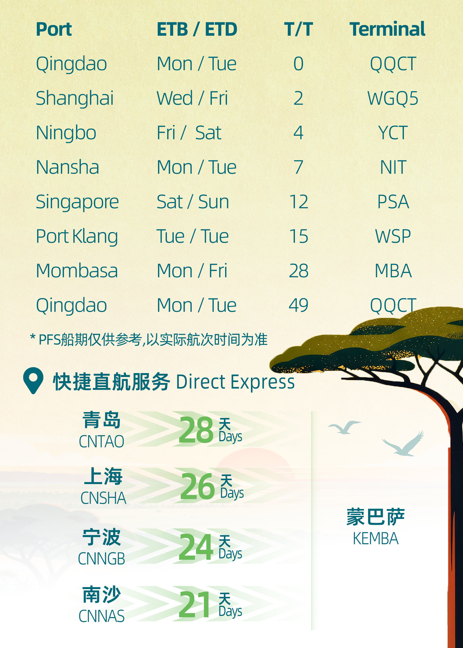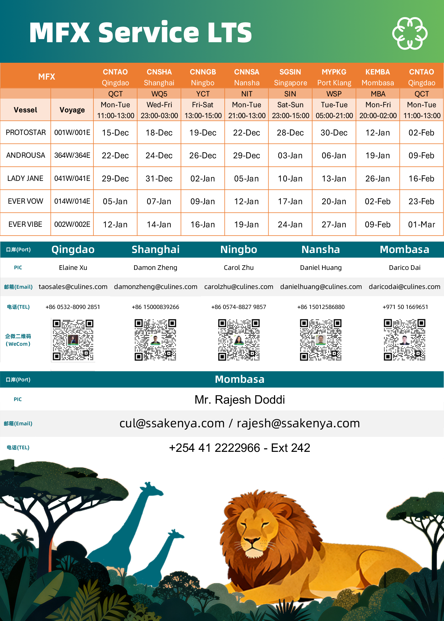 CULines is pleased to announce the launch of its new MFX (Mombasa Far East Express) service, effective December 15. This new services further enhances our service coverage in Africa and responds to growing customer demand for efficient transportation solutions, offering a fast and direct connection from China to Mombasa, Kenya.