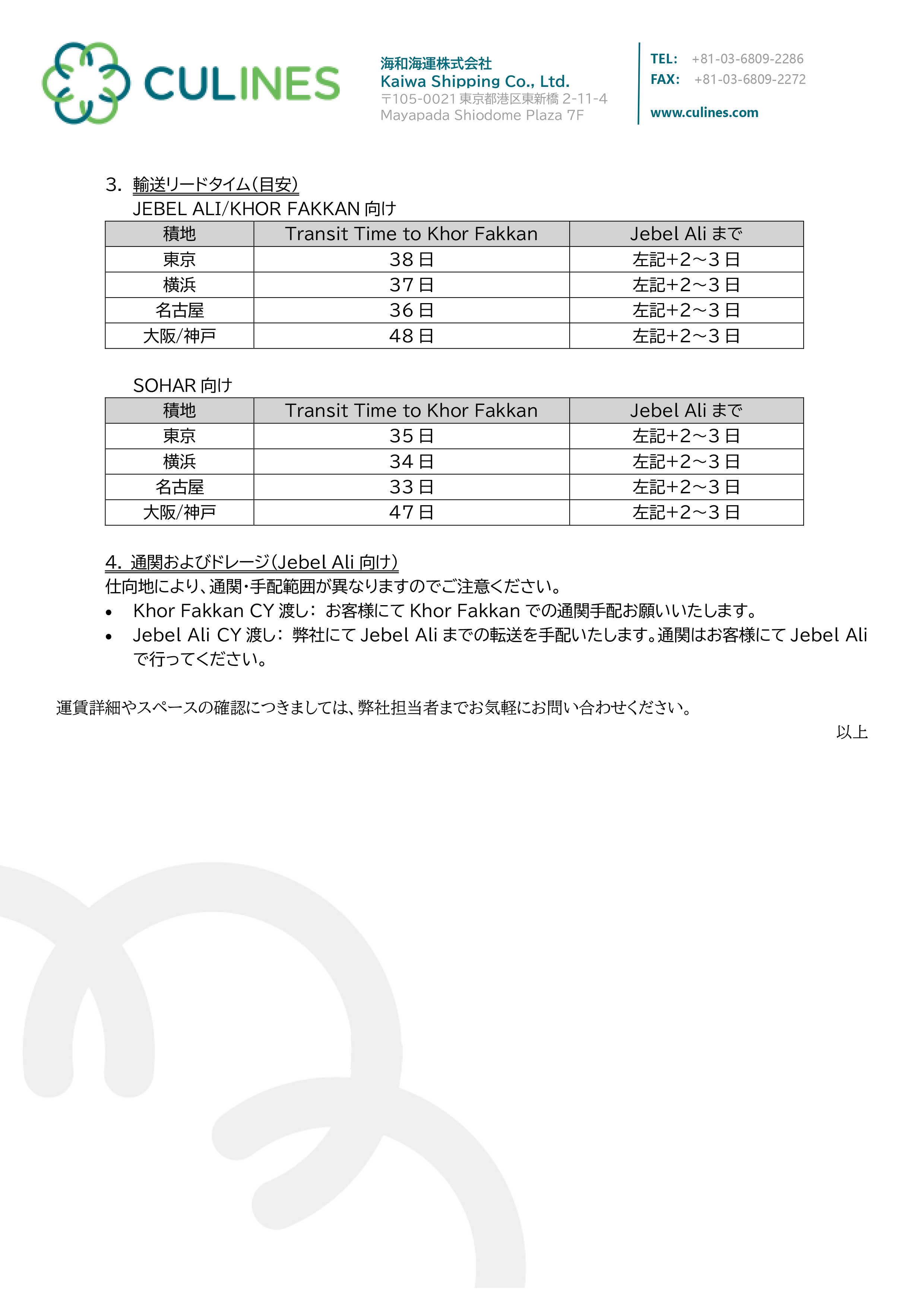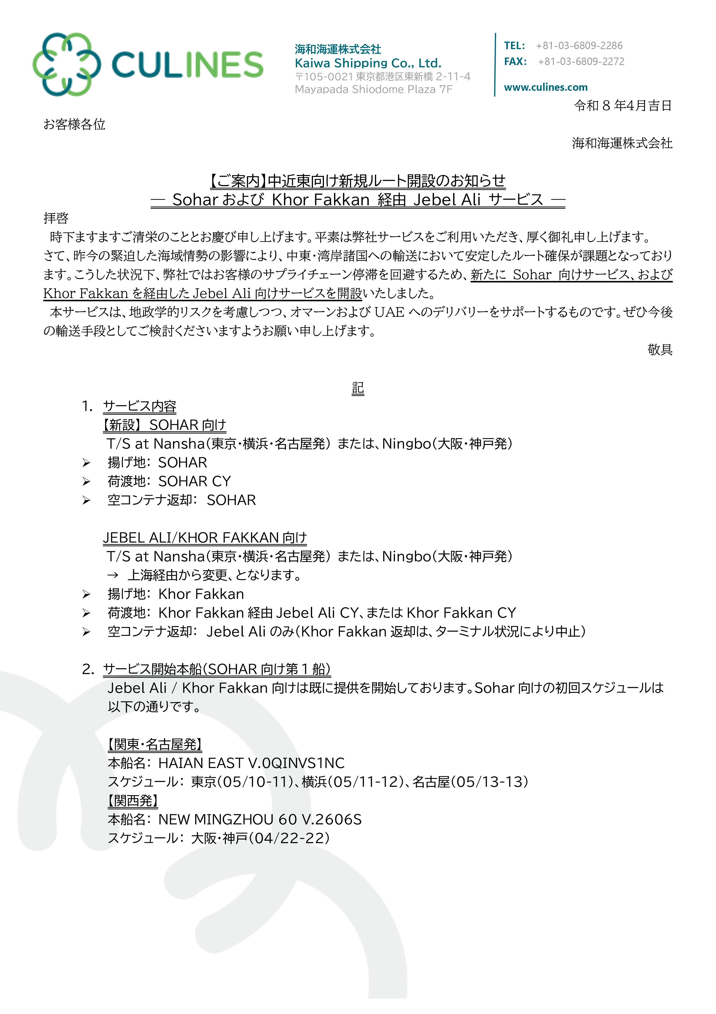 Khor Fakkan 経由 Jebel Ali 向けサービス開始のご案内
