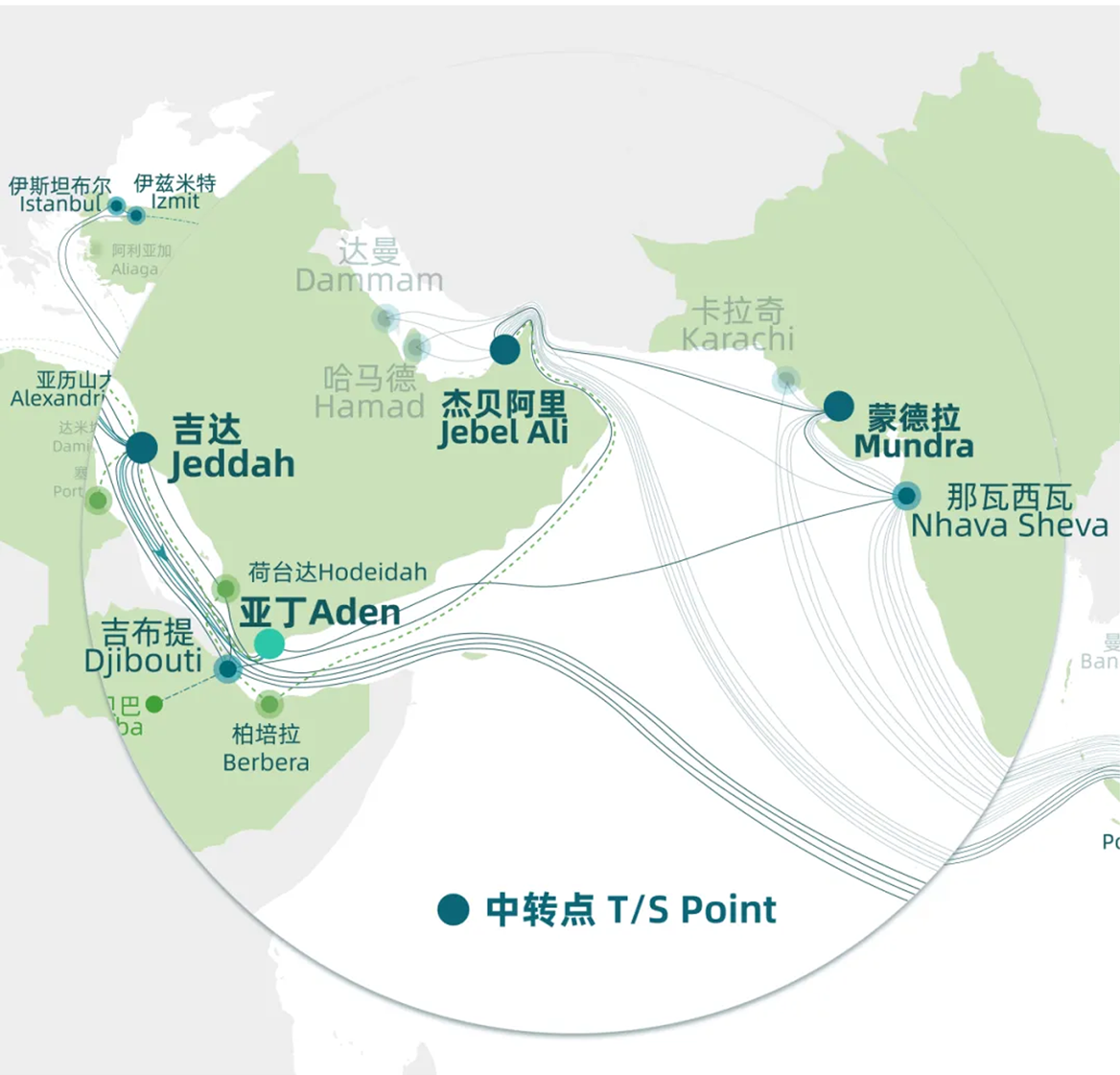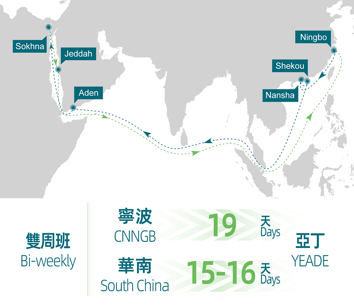 幹線AEM / JFX / CIS / CSX / CWX,搭配紅海 IMR、SJA 兩條投船航線,經蒙德拉、傑貝阿里或吉達均可一次中轉通達亞丁。蘇科納的航線服務同樣也新增了中轉保障。
